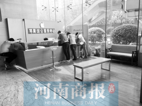 昨天上午,河南商報記者來到了升龍大廈一樓。該手機維修點有多處“蘋果”的標(biāo)志,柜臺里也全是蘋果手機以及相關(guān)配套產(chǎn)品,有兩個消費者在維修蘋果手機。