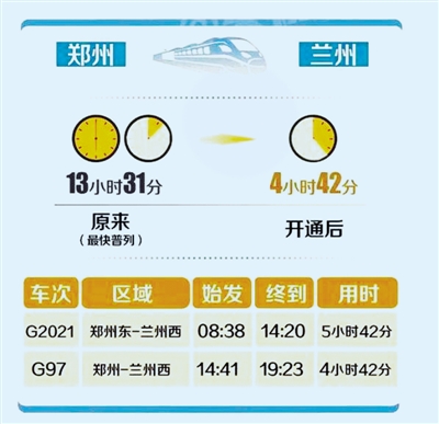 據(jù)鄭州東站工作人員介紹,即日起鄭州東站每天將有18趟往返蘭州的高鐵列車(具體列車車次、開(kāi)行日期以12306網(wǎng)站以及車站公告為主),其中始發(fā)高鐵列車3趟。鄭州到蘭州最快的車次為G97,從鄭州車站至蘭州西站,中間經(jīng)停西安北、天水南站,全程僅需4小時(shí)42分。這較之前最快的Z265次列車足足縮短了將近8個(gè)小時(shí)。
