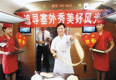 為了慶祝首發(fā),李惠萍帶領(lǐng)幾名高姐,策劃了各種小環(huán)節(jié)來(lái)和旅客互動(dòng),現(xiàn)場(chǎng)做燴面、拉牛肉面,整個(gè)車廂熱熱鬧鬧。