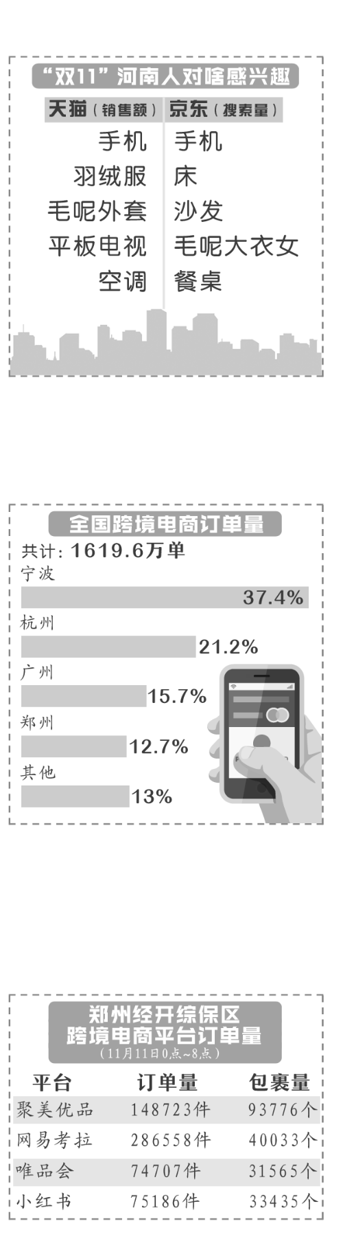 除了“剁手”族,鄭州的跨境電商平臺在這場狂歡中的表現(xiàn)也十分搶眼。11月12日,河南商報記者從河南出入境檢驗檢疫局獲悉,海關(guān)總署統(tǒng)計數(shù)據(jù)顯示,僅11月11日,全國跨境單量共計1619.6萬單,其中,鄭州占比12.7%。