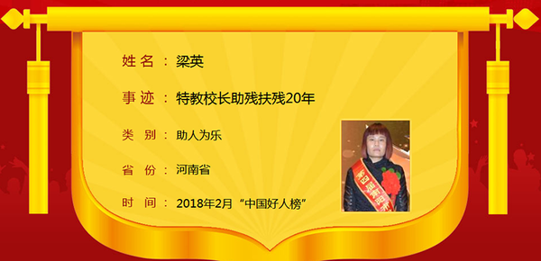 從一個(gè)失業(yè)的下崗女工,到今天的特教學(xué)校校長(zhǎng),梁英用她的博愛(ài)之心扶殘助殘20年。20年來(lái),她先后投入40多萬(wàn)元,免費(fèi)培訓(xùn)并安排就業(yè)殘疾人2000多人,她因此也成為殘疾朋友心目中的愛(ài)心大使。其個(gè)人先后被評(píng)為河南好人、河南省扶殘助殘先進(jìn)個(gè)人等。