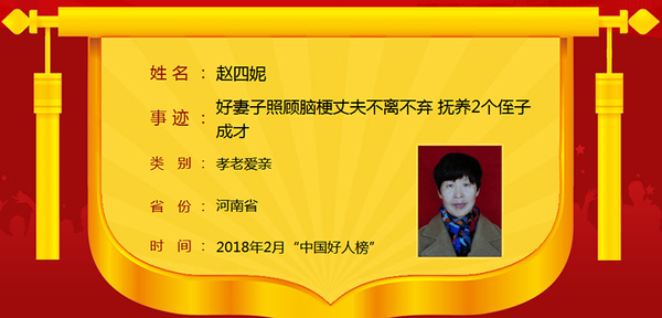 趙四妮出生在一個(gè)普通的農(nóng)村家庭里。窮人的孩子早當(dāng)家,為了照顧臥病在床的父母,趙四妮毅然決定輟學(xué),尋醫(yī)問(wèn)藥,端茶倒水,榻前侍奉,她給父母以最周到的照顧和最貼心的安慰。然而,三年后父母還是因病情加重而相繼去世了。痛失雙親的趙四妮還未從痛苦中解脫出來(lái),本來(lái)身體就不好的哥哥又患上了心腦血管疾病和糖尿病,病臥在床且雙目失明,她的嫂子撇下兩個(gè)年幼的孩子也離家出走了。從此趙四妮既要照顧起居難以自理的哥哥,又要撫養(yǎng)兩個(gè)年幼的侄子,幾個(gè)月后,重病纏身的哥哥也離開(kāi)人世。后來(lái),大侄子如愿上了大學(xué),二侄子高中畢業(yè)后也參軍入伍,兩個(gè)侄子在自己的拉扯下總算熬出了頭,自己兒女學(xué)業(yè)也有所成,但趙四妮的丈夫楊自立患上了突發(fā)腦梗,生活不能自理。她不斷給丈夫笑容、信心和鼓勵(lì),不分白晝黑夜端茶倒水,舒筋按摩,無(wú)微不至的照料使得丈夫能勉強(qiáng)下床行走。
