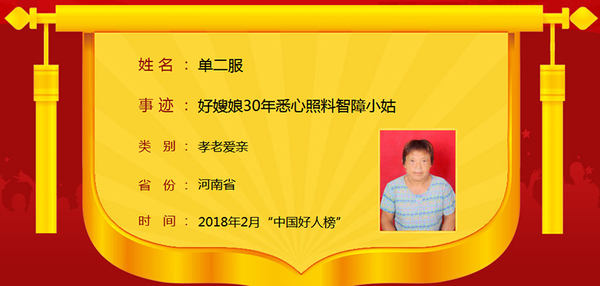 自從1987年嫁到丈夫郭星奎家后,單二服就一直把智障的小姑子郭紅勤當(dāng)成自己的親妹妹精心照料。2010年,單二服的婆婆去世,再加上丈夫外出打工,照顧智障小姑子的重任,就落到了她一個(gè)人的身上,但單二服毫無(wú)怨言繼續(xù)關(guān)心、照顧著婆家小姑子。30年來(lái),她用平凡而又偉大的愛(ài)心感動(dòng)了周圍的人,被鄉(xiāng)鄰廣為稱贊。(安艷鴿)