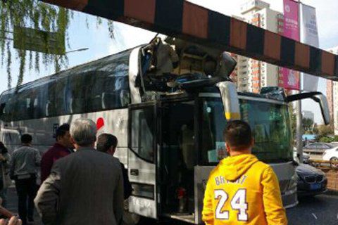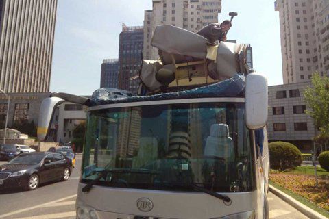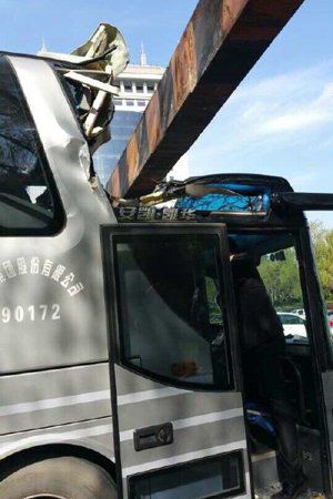 北京大巴車撞上限高桿 車頂凹陷無傷亡