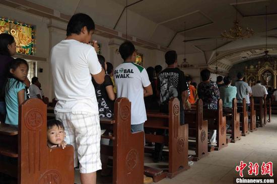 11月17日,菲律賓中部港口城市奧爾莫克大批民眾在當?shù)匾蛔烫脜⒓訌浫觯瑢で缶裎拷?。中新社發(fā) 張明 攝