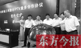 映象網(wǎng)訊(首席記者 梁新慧/文 記者 沈翔/圖)只要擁有一部IPTV機(jī)頂盒,普通的電視機(jī)就會(huì)擁有多種強(qiáng)大的功能,想怎么看就怎么看。這種美妙的感覺,將在今年年底前變?yōu)楝F(xiàn)實(shí)。11日,經(jīng)中國(guó)網(wǎng)絡(luò)電視臺(tái)授權(quán),愛上電視傳媒有限公司與河南電視臺(tái)、中國(guó)聯(lián)通河南分公司在中原福塔簽署河南省三網(wǎng)融合IPTV合作協(xié)議,此舉標(biāo)志著河南省三網(wǎng)融合工作取得了重大進(jìn)展。
