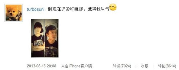 8月18日20點(diǎn)08分,孫儷通過(guò)微博曬和鄧超同傳情侶裝的照片,并稱(chēng):“到現(xiàn)在還沒(méi)吃晚飯,餓得我生氣!”照片中,兩人身穿黑色T恤情侶裝,很默契的把鴨舌帽的帽檐戴在后面,夫妻二人都歪眼斜視,橫眉冷對(duì),看上去似有仇一樣。