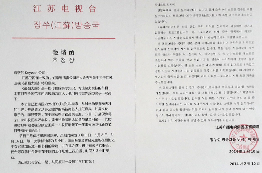 應(yīng)廣大粉絲的強(qiáng)烈呼聲,江蘇衛(wèi)視決定邀請金秀賢參加《最強(qiáng)大腦》國際PK賽的錄制。昨日中午,江蘇衛(wèi)視《最強(qiáng)大腦》在其官方微博發(fā)布了一條重磅消息:節(jié)目組已于2月10日向“都教授”金秀賢所屬的韓國經(jīng)紀(jì)公司Keyeast發(fā)出邀請函,誠意邀請其擔(dān)任《最強(qiáng)大腦》的特約嘉賓。