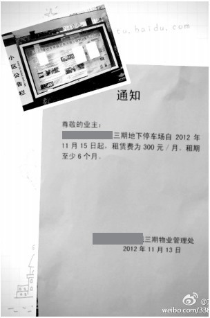 他稱將盡快對微博上的投訴進(jìn)行回復(fù),以消除通知帶來的影響和誤會,同時將收集業(yè)主意見,慎重考慮停車位費用問題。