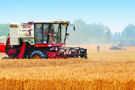 6月9日,收割機正在延津縣搶收小麥。豫北小麥每年收割較晚,單產(chǎn)最高,今年產(chǎn)量有望好于去年。記者 王天定 攝