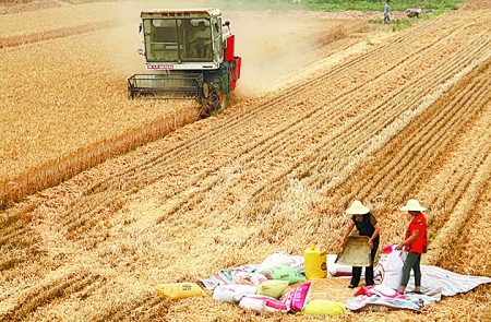 6月9日,收割機在武陟縣龍泉辦事處郭堤村作業(yè)。目前,武陟縣已收獲小麥43萬畝,收獲面積過半。馮小敏 攝
