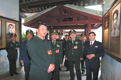 10月31日上午,習(xí)近平帶領(lǐng)全體中央軍委委員一起參觀會址。習(xí)近平來到當年毛澤東作政治報告的廳堂,凝望著廊柱上富有鮮明戰(zhàn)斗性的標語,注視著當年會議代表取暖留下的斑斑炭火印跡,同大家一起回憶先輩們探尋革命道路時篳路藍縷、艱辛奮斗的情景,并向大家介紹他每次來古田參觀的情形和感受。