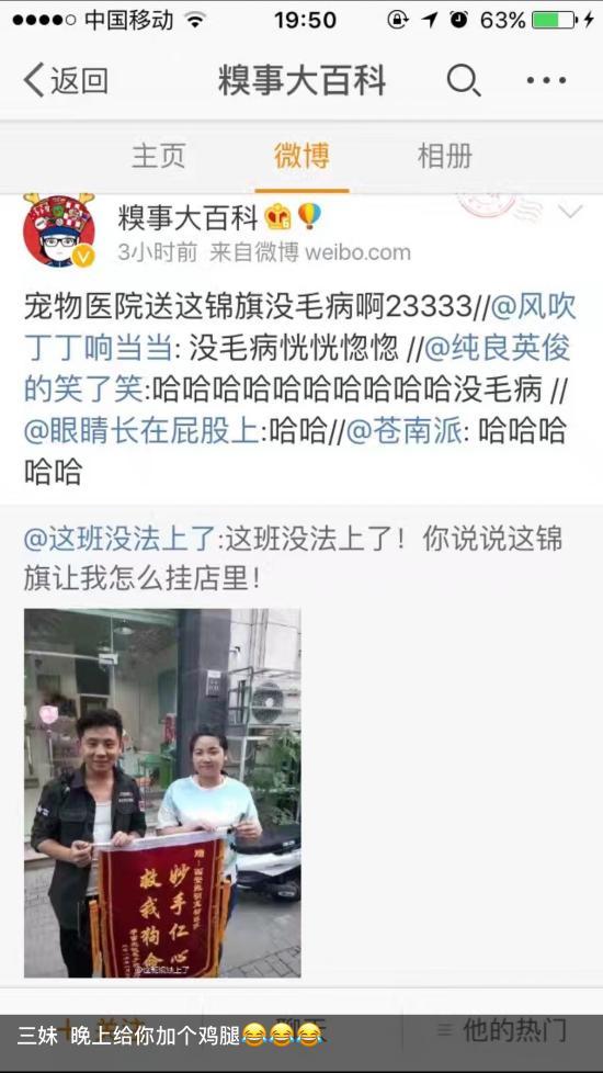 “狗狗三妹是今年4月份送到這里醫(yī)治的,8月7日送來(lái)了錦旗,和我們醫(yī)護(hù)人員合影。沒(méi)想到最近突然在微博火了,一覺(jué)醒來(lái),很多客戶(hù)叫我網(wǎng)紅?!闭衩鲗櫸镝t(yī)院院子孫振明說(shuō),有人贊揚(yáng)勇氣,有人嘲笑謾罵,但如果你要是知道事情的始末,你就不會(huì)覺(jué)得可笑?這是一個(gè)關(guān)于愛(ài)、守護(hù)和堅(jiān)持的故事。