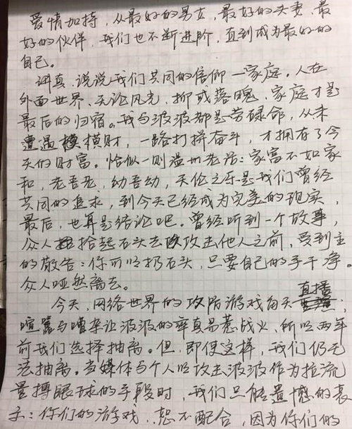 網(wǎng)易娛樂1月26日報道 日前,演員周立波在美國長島因涉嫌持有槍支、藏有毒品而被美國警方逮捕,在繳納保釋金后獲得保釋。此前周立波先是在美國通過媒體表示“持有的槍支合法,毒品并非其所有。之后還曾發(fā)微博自證“事實(shí)和法律將還我清白”。而就在1月26日早上,周立波妻子胡潔通過微博發(fā)布自己的一封手寫信,力贊丈夫周立波“完美”。對于近日的是非,她更表示“請不要過早下結(jié)論,先操心自己的生活”。