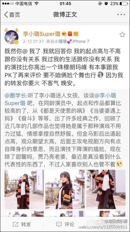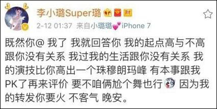 這條微博讓李小璐怒了。李小璐隨后轉(zhuǎn)發(fā)并寫道:“既然你@ 我了,我就回答你,我的起點(diǎn)高與不高跟你沒有關(guān)系,我過我的生活跟你沒有關(guān)系,我的演技比你高出一個珠穆朗瑪峰,有本事跟我PK了再來評價,要不咱倆尬個舞也行,因?yàn)槲业霓D(zhuǎn)發(fā)你要火,不客氣,晚安。”