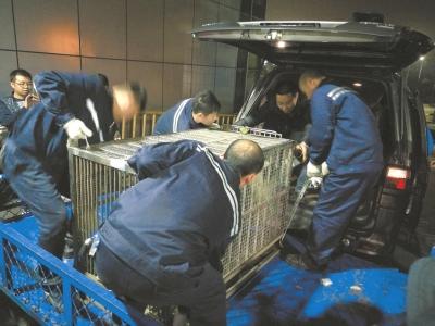 經(jīng)過近一個(gè)半小時(shí)的空中旅行,剛下飛機(jī)的“蜀蘭”還有一點(diǎn)驚慌。面對機(jī)場運(yùn)輸工作人員,她有些焦慮地在籠子里轉(zhuǎn)來轉(zhuǎn)去,變換姿勢。