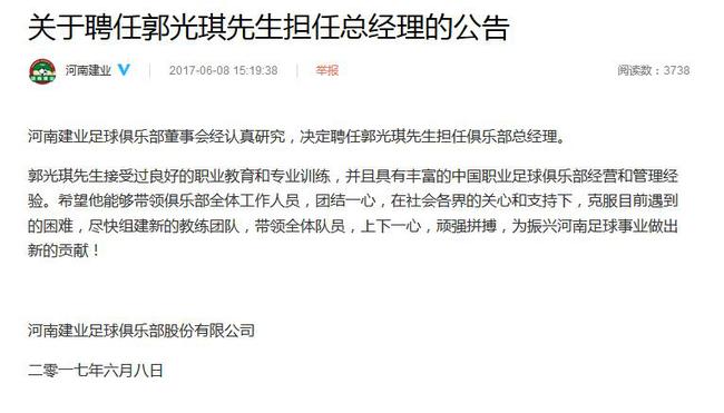 6月8日,中超河南建業(yè)官方宣布,郭光琪將出任俱樂(lè)部總部經(jīng)理一職。俱樂(lè)部希望在郭光琪的帶領(lǐng)下,球隊(duì)上下一心,為振興河南足球做出新貢獻(xiàn)。