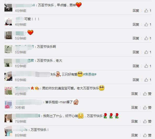 網(wǎng)友也紛紛評(píng)論說(shuō):“男的帥女的美寶寶可愛(ài)。老大萬(wàn)圣節(jié)快樂(lè)”、“老大千鈺姐萬(wàn)圣節(jié)快樂(lè)?。。∥以趯?xiě)作業(yè)里贏來(lái)了萬(wàn)圣節(jié)orz……老大晚上早點(diǎn)睡呀,雖然可能會(huì)有很多小孩子來(lái)敲門(mén)說(shuō)“不給糖就搗蛋”吧,hhhhhhh”