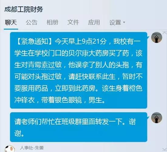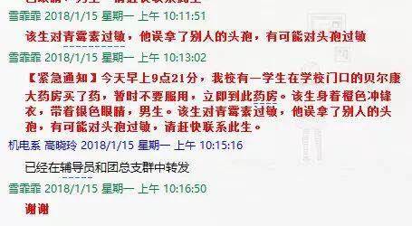 發(fā)布的消息內(nèi)容為:“【緊急通知】今早上9點(diǎn)21分,我校有一學(xué)生在學(xué)校門(mén)口的貝爾康大藥房買(mǎi)了藥,該生對(duì)青霉素過(guò)敏,他誤拿了別人的頭孢,有可能對(duì)頭孢過(guò)敏,請(qǐng)趕快聯(lián)系此生,暫時(shí)不要服用藥品,立即到此藥房。該生身著橙色沖鋒衣,戴銀色眼鏡,男生?!?/p>