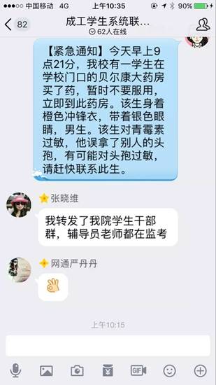 隨即,一場(chǎng)全校上下師生全員大尋找的緊急尋人隨即展開(kāi)。校方在學(xué)校各個(gè)平臺(tái)及所有輔導(dǎo)員群將該消息發(fā)布出去,同時(shí)通過(guò)短信平臺(tái)向所有在校學(xué)生群發(fā)短信,希望找到該名拿錯(cuò)藥的學(xué)生。