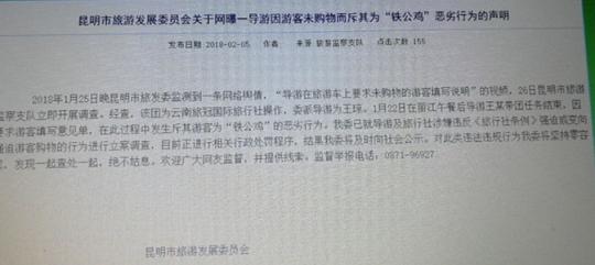 近日,網(wǎng)傳云南一導(dǎo)游斥未購物游客為“鐵公雞”,引發(fā)關(guān)注。昆明市旅發(fā)委稱,2018年1月25日晚昆明市旅發(fā)委監(jiān)測到一條網(wǎng)絡(luò)輿情,“導(dǎo)游在旅游車上要求未購物的游客填寫說明”的視頻,26日昆明市旅游監(jiān)察支隊立即開展調(diào)查。