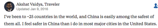 當(dāng)然,在中國(guó)旅游對(duì)老外的吸引力不只是便捷。一位去過全世界二十多個(gè)國(guó)家的外國(guó)驢友總結(jié)說,“中國(guó)是我去過的最安全的國(guó)家之一。我感覺在中國(guó)的大型城市比在美國(guó)安全多了?!?/p>