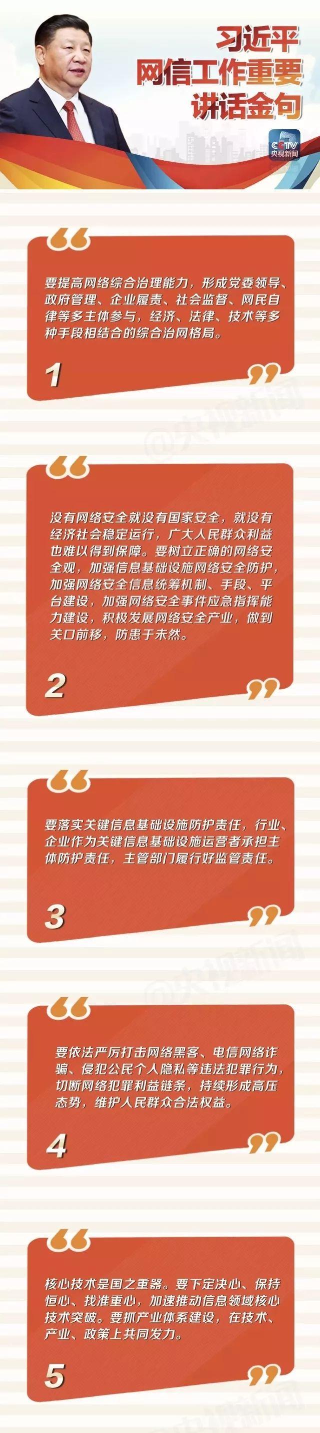 習(xí)近平總書記的重要講話從黨和國(guó)家事業(yè)全局出發(fā),全面總結(jié)了黨的十八大以來我國(guó)網(wǎng)絡(luò)安全和信息化工作取得的歷史性成就、發(fā)生的歷史性變革,系統(tǒng)闡釋了網(wǎng)絡(luò)強(qiáng)國(guó)戰(zhàn)略思想的豐富內(nèi)涵,科學(xué)回答了事關(guān)網(wǎng)信事業(yè)長(zhǎng)遠(yuǎn)發(fā)展的一系列重大理論和實(shí)踐問題,為把握信息革命歷史機(jī)遇、加強(qiáng)網(wǎng)絡(luò)安全和信息化工作、加快推進(jìn)網(wǎng)絡(luò)強(qiáng)國(guó)建設(shè)明確了前進(jìn)方向、提供了根本遵循,具有重大而深遠(yuǎn)的意義。大家要認(rèn)真學(xué)習(xí)領(lǐng)會(huì),深入思考、聯(lián)系實(shí)際、深化認(rèn)識(shí),切實(shí)把思想和行動(dòng)統(tǒng)一到習(xí)近平總書記重要講話精神上來。進(jìn)一步提高政治站位,從黨長(zhǎng)期執(zhí)政和國(guó)家長(zhǎng)治久安的高度,切實(shí)增強(qiáng)責(zé)任感和使命感,推動(dòng)網(wǎng)絡(luò)安全和信息化工作再上新臺(tái)階。