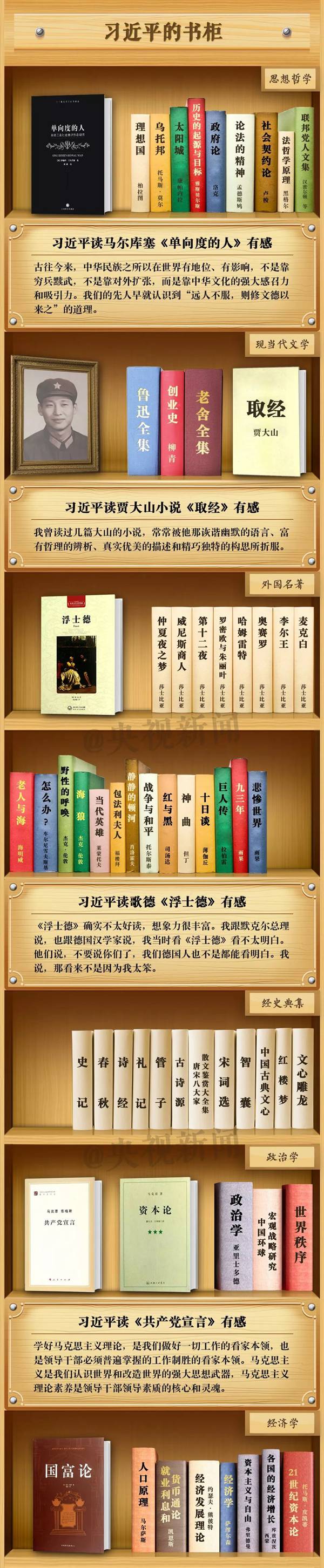 在這個(gè)節(jié)日,央視新聞定制了習(xí)近平總書記的“書柜”,來看看總書記的“書單”和讀書感悟吧。