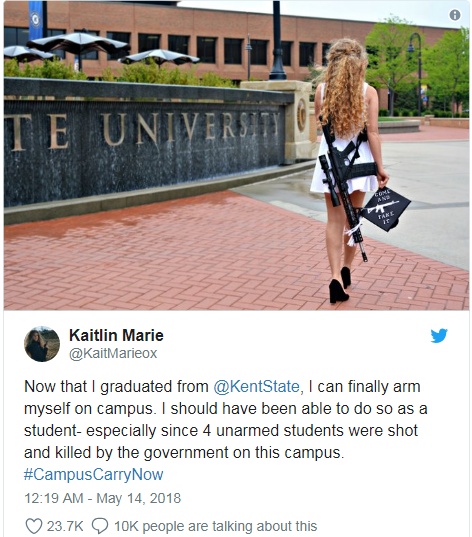 報道稱,凱特琳·班內(nèi)特畢業(yè)于位于俄亥俄州的州立肯特大學(xué),取得了生物學(xué)學(xué)位。畢業(yè)后的第二天,這名22歲的女孩返回校園,肩背一把AR-10半自動步槍,手拿頂上印有“有膽來拿”字樣(美國獨立戰(zhàn)爭的口號)的畢業(yè)帽,還拍了照并發(fā)到了網(wǎng)上。