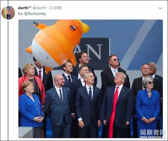 但是,白宮社群媒體主任史卡比諾 (Dan Scavino Jr。)卻站出來指責“假新聞”。他表示,當時各國領導人正在抬頭看天空中飛過的13國直升機,并配上了一張動作整齊劃一的照片。