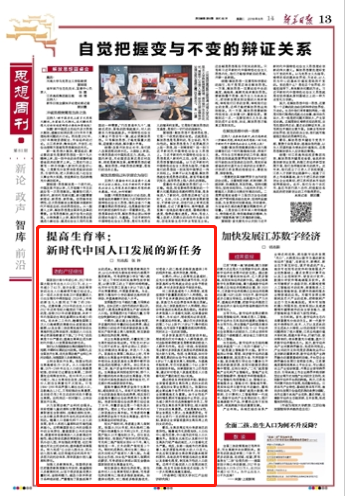 8月14日,江蘇省委機(jī)關(guān)報《新華日報》在第13版“思想周刊·智庫”欄目刊發(fā)了劉志彪、張曄聯(lián)合撰寫的題為《提高生育率:新時代中國人口發(fā)展的新任務(wù)》的署名文章。