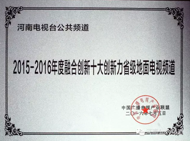 7月9日至12日,2016全國(guó)電視節(jié)目模式創(chuàng)新交流年會(huì)在黑龍江省黑河市舉行。河南電視臺(tái)公共頻道榮獲2015-2016年度融合創(chuàng)新十大創(chuàng)新力省級(jí)電視頻道。