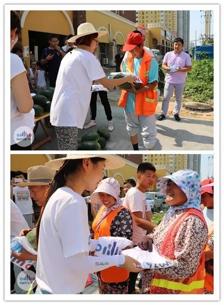 我們給他們每人都送了一個西瓜,遞到他們手里跟他們說:“你們辛苦了!”的時候,我們明顯能夠感覺到他們的喜悅,他們飽經(jīng)風霜的臉上洋溢的笑容,讓人覺得特別溫馨、真誠。
