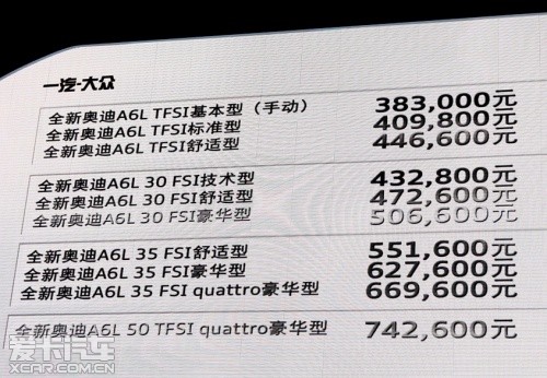 | 全新奧迪A6L車型 | 官方指導價(萬元) |