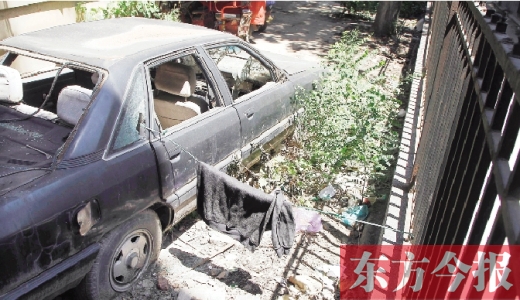 在采訪中得知,國棉三廠綠化街也有一輛“僵尸車”。東方今報記者在現(xiàn)場看到,這是一輛黑色馬自達(dá)轎車,經(jīng)過長時間的風(fēng)吹雨打,油箱蓋、雨刮器、車頭銹跡斑斑,車頂凹陷,引擎蓋上放著一塊磚,同樣沒有車牌號。