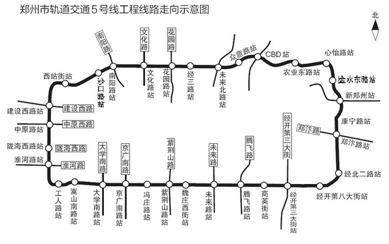鄭州地鐵5號線線路沿黃河路、黃河?xùn)|路、商務(wù)外環(huán)路、龍湖外環(huán)路、盛和街、心怡路、經(jīng)開第十大街、航海路、桐柏路和西站路布置,屬于城市核心區(qū)外圍的環(huán)形線路。5號線全長約40.4公里,設(shè)車站32座,換乘站15座,平均站間距約1.26公里。全線設(shè)一段一場,共設(shè)置兩座主變電所,采用集中供電方式。