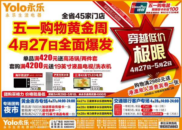 別郁悶,這個(gè)五一去永樂吧。據(jù)了解,今年五一,永樂電器出招將一貫的低價(jià)策略穿越到底,以自身強(qiáng)大的實(shí)力和影響力大打降價(jià)牌,讓消費(fèi)者以最優(yōu)惠的價(jià)格買到最中意的電器?!敖衲晡逡坏慕祪r(jià)力度,比任何一次黃金周都要生猛?!庇罉冯娖髫?fù)責(zé)人表示,“今年五一,永樂是實(shí)打?qū)嵉牡蛢r(jià)讓利?!?/p>