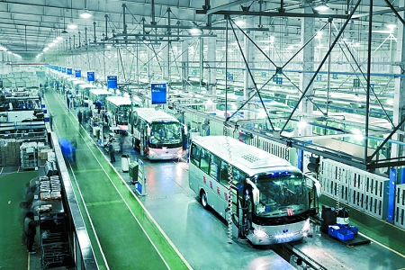 4月19日,現(xiàn)代化的宇通客車生產(chǎn)線正快速運轉(zhuǎn)。今年一季度,鄭州宇通客車股份有限公司共銷售各類客車10168輛,成為行業(yè)內(nèi)唯一超過萬輛的企業(yè)。其中,共出口各類客車1531輛,出口額達(dá)到了10.12億元,出口量和出口額均名列行業(yè)第一。 河南日報記者 王 錚 攝