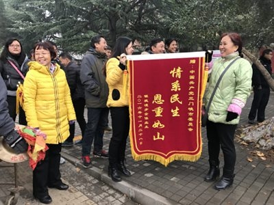 11月29日,三門峽市銀堤漫步小區(qū)數十位業(yè)主敲鑼打鼓冒雨將兩面寫有“情系民生 恩重如山”、“心系百姓 為民排憂”的錦旗送到三門峽市委和市政府,感謝新的領導班子為他們千余戶業(yè)主解決了存在五年的住房難問題。