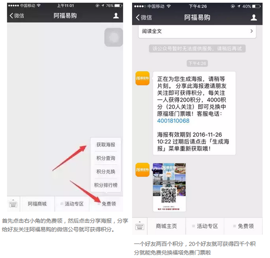 11月21日——11月25日和11月28日——12月2日十天時(shí)間里,每天免費(fèi)送票100張,怎么領(lǐng)取?先搜索并關(guān)注“阿福易購(gòu)”微信公號(hào),剩下的您可看好了。