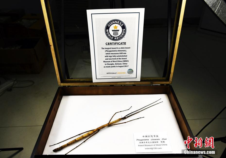 圖為中國巨竹節(jié)蟲(Phryganistria chinensis Zhao )最長個體,與獲得的吉尼斯世界紀(jì)錄證書。