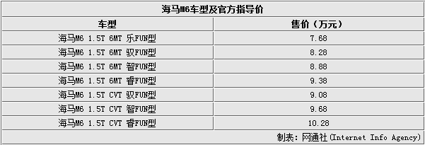 M6作為海馬2.0時代重要的一款車型,moofun系統(tǒng)的加入使得該車在造車理念上就與以往不同,加之外觀造型上運動流暢的轎跑風格,內(nèi)飾也更加年輕化布局,黃金的動力組合,該車的整體性能可圈可點,7.68萬元的起售價也足夠親民,相信海馬M6的市場前景將非常廣闊。(網(wǎng)通社 2015年4月20日 上海報道)