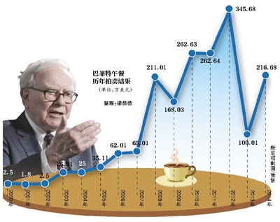 競得者中也不乏華人的身影。2006年,定居美國加州的華人段永平出價62.01萬美元拔得頭籌。兩年之后,被譽(yù)為中國私募教父、赤子之心中國成長投資基金董事趙丹陽用211.01萬美元實現(xiàn)了和巴菲特共進(jìn)午餐。不過,也有一些獲得午餐門票的人至今未向公眾透露身份姓名。記者 梁薇薇