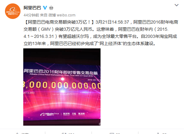 阿里巴巴3月21日宣布,截至3月21日14:58:37,阿里巴巴2016財(cái)年電商交易額(GMV)突破3萬(wàn)億元人民幣。這意味著,阿里巴巴在財(cái)年內(nèi)(2015.4.1-2016.3.31)有望超越沃爾瑪,成為全球最大零售平臺(tái)。