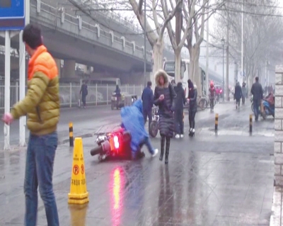 附近一名環(huán)衛(wèi)工稱,昨日凌晨,有泔水車經(jīng)過,將泔水油灑了一地,夜里凍成一條冰帶,早上很多人在這里摔倒,他就親眼看見,一個多小時有四五十輛電動車翻倒。