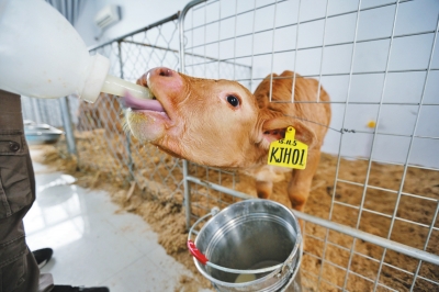 技術員呂博說,小牛犢們也是一日三餐,每次喂2公斤奶粉外,還加些犢牛顆粒飼料和干草。預計3個月大后,將逐步給它們斷奶。