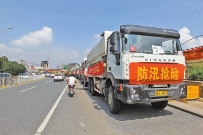昨天,武漢市江漢區(qū)沿江大道,一排排渣土車滿載渣土,??吭诼愤?。長江北岸的堤壩上,到處張貼著“人在堤在”、“誓死保衛(wèi)大武漢”等宣傳標(biāo)語。