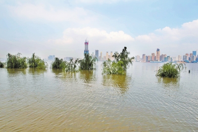 武漢,江灘上的大樹只露出樹梢。