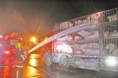 救援的消防官兵告訴大河報(bào)記者,現(xiàn)場需緊急救援的共有3輛運(yùn)豬車,約300頭豬。了解情況后,消防官兵隨即利用水槍向生豬噴水降溫,一個(gè)多小時(shí),原來無精打采的生豬開始活泛起來,待高速通行司機(jī)連忙開往目的地。