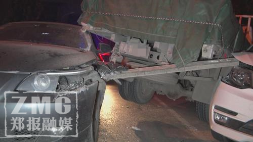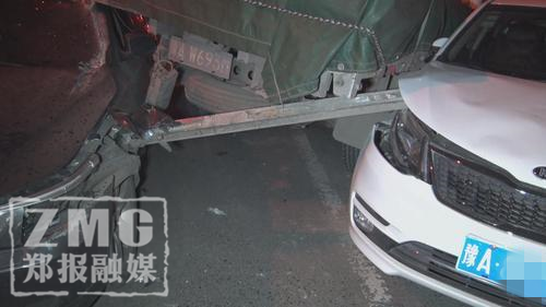 鄭報融媒記者看到,肇事寶馬車為懸掛豫A號牌的灰色5系轎車,該車車頭左側撞擊卡車后保險杠后受損嚴重,受傷部位由車身延伸至駕駛艙,鐵質車身被劃開一道約20厘米寬的口子,駕駛位上方車頂部位則卡在了卡車車尾之下。